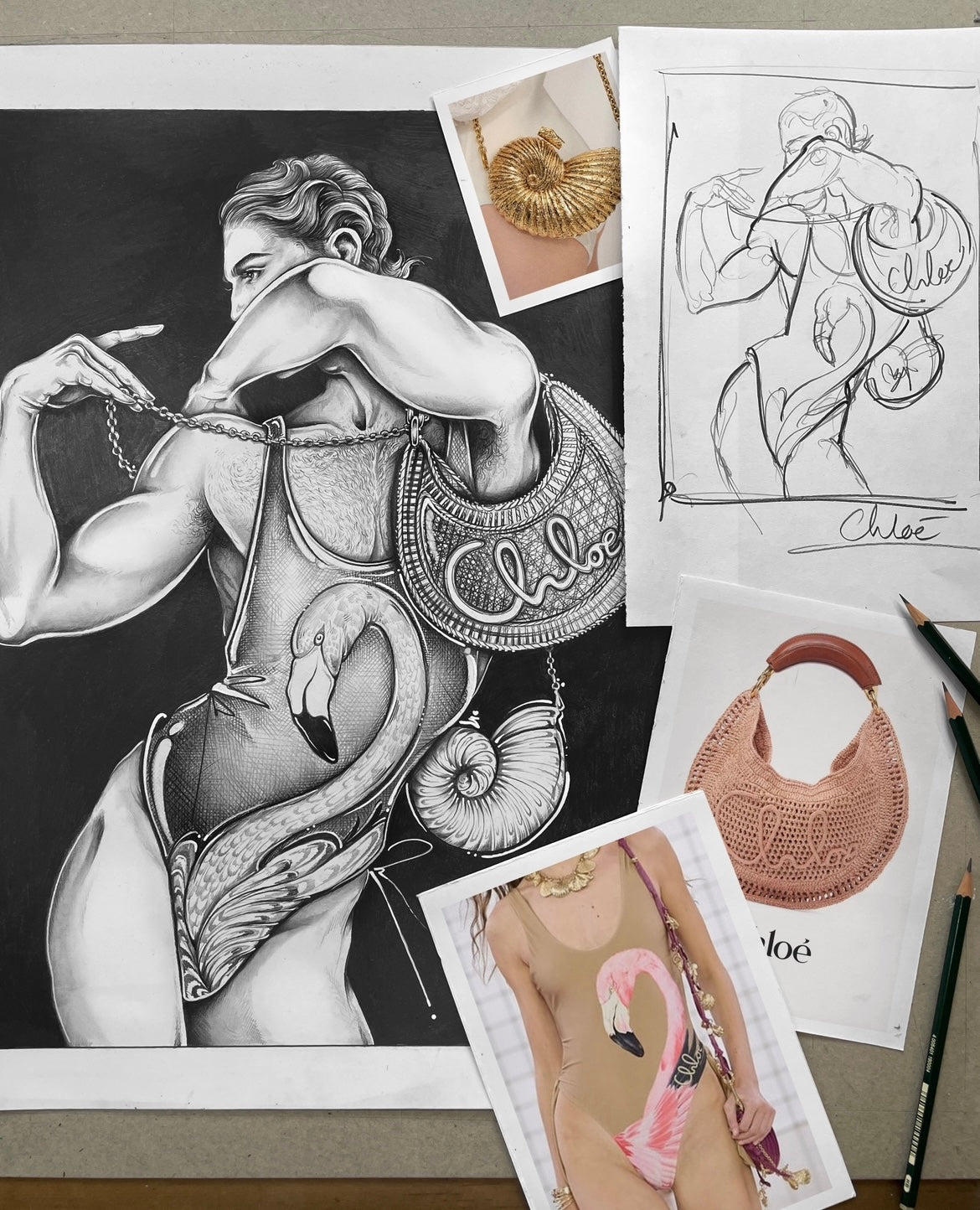 Inspired by the Chloe Flamingo Cut Out One-Piece Swimsuit, The Summer Banana Crochet Bag & the Sea Treasures Shell Minaudière designed by Chemena Kamali.