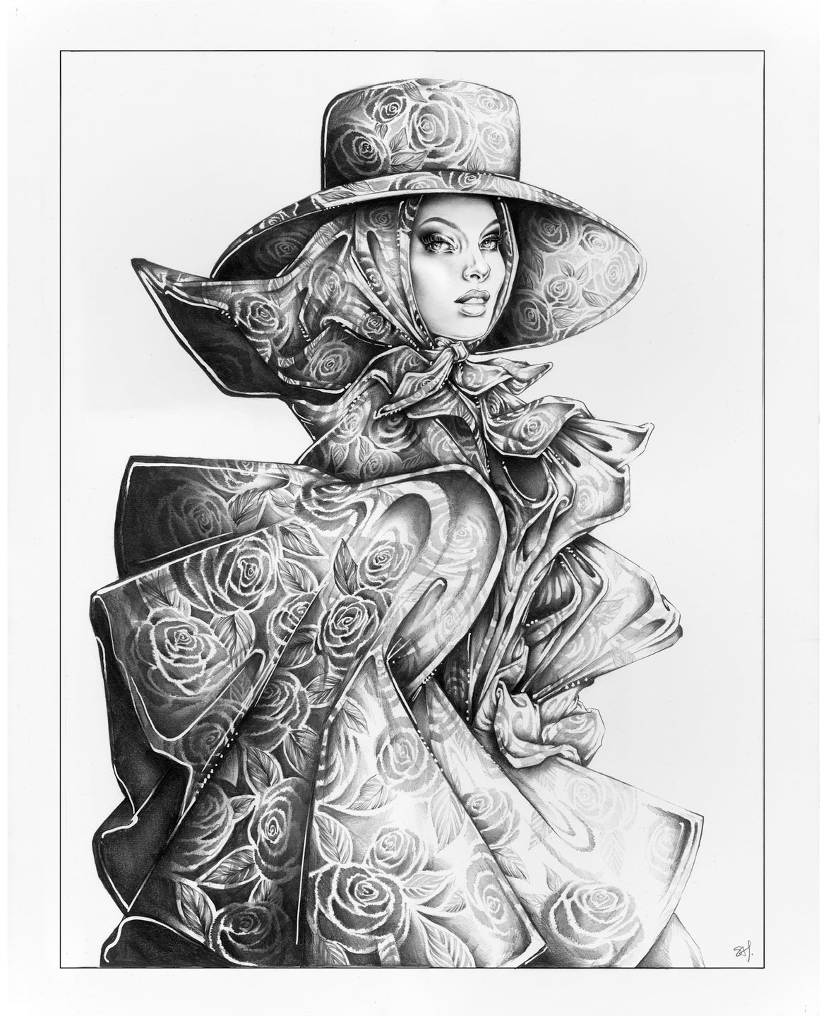 Original hand drawn Linda Evangelista inspired illustration created using graphite pencil on paper. Inspired by Evangelista's return to the cover of British Vogue 2023, wearing head-to-toe Richard Quinn. Unframed.