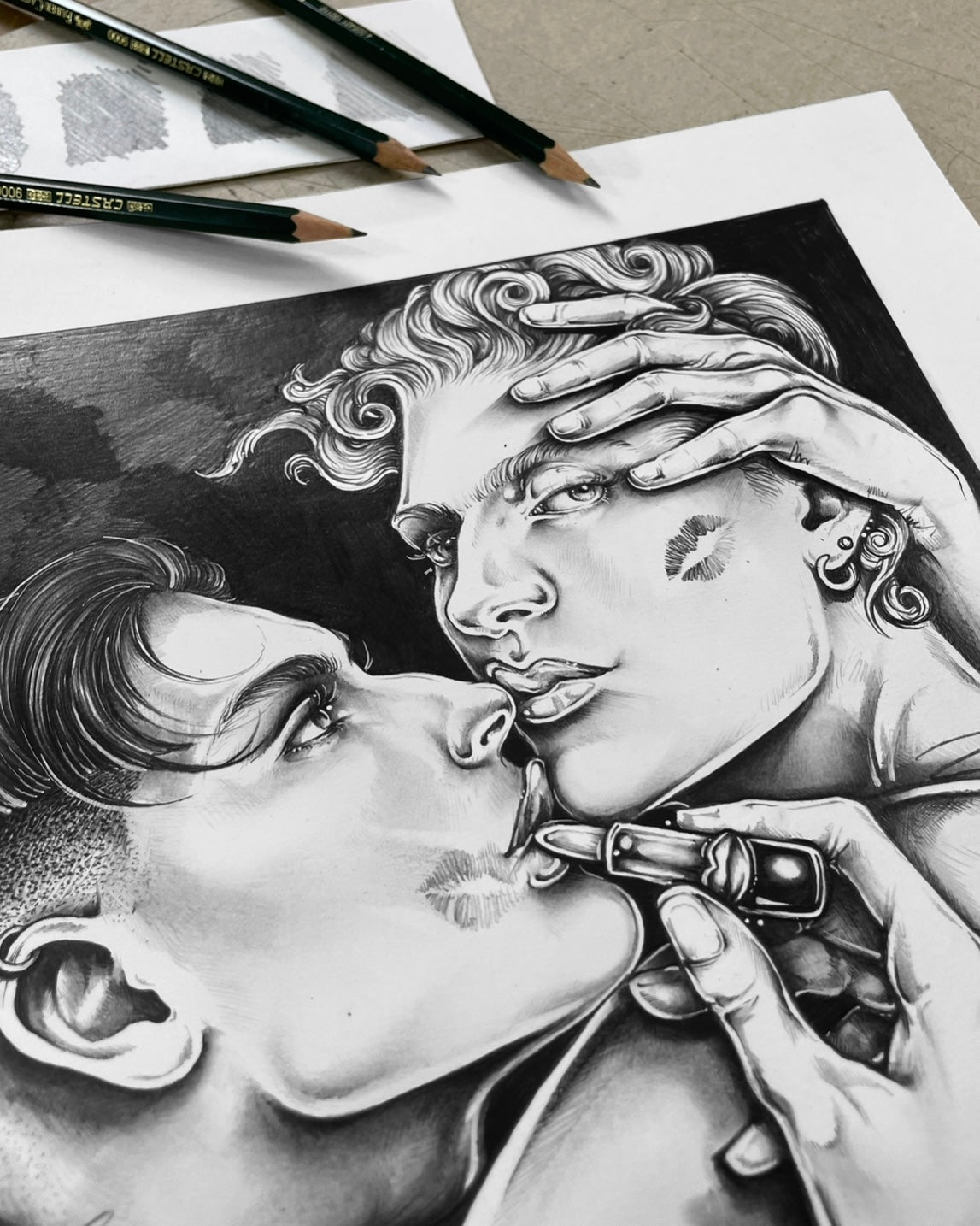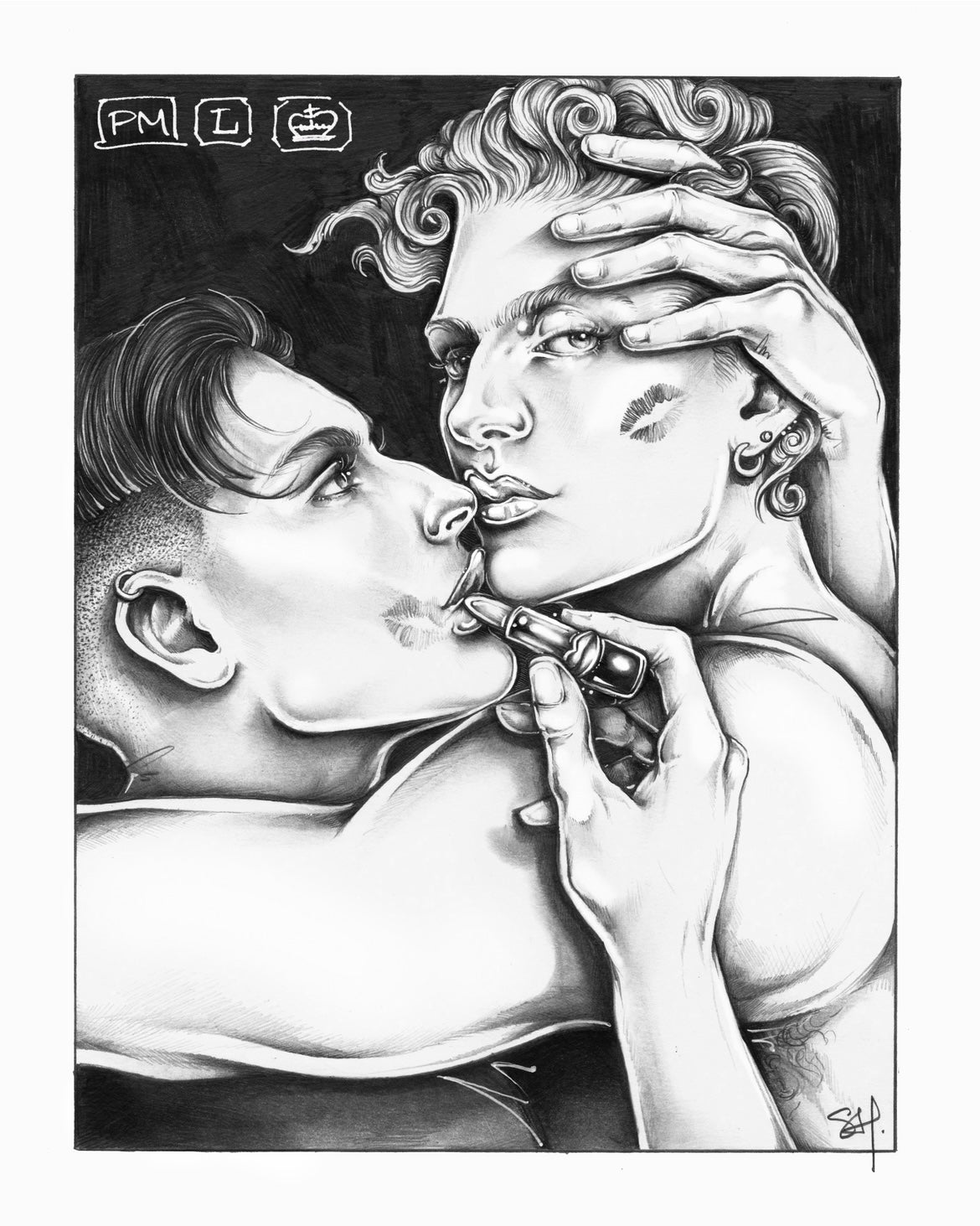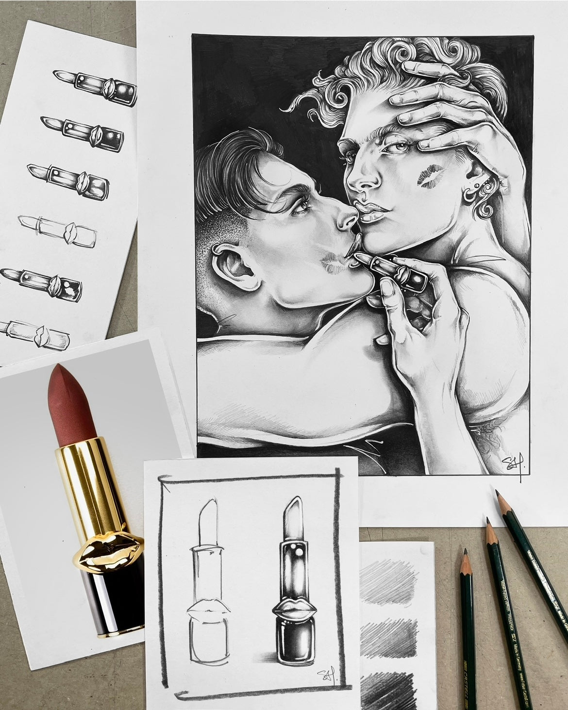 Fashion illustration inspired by men using the Pat McGrath Labs MatteTrance Lipstick.