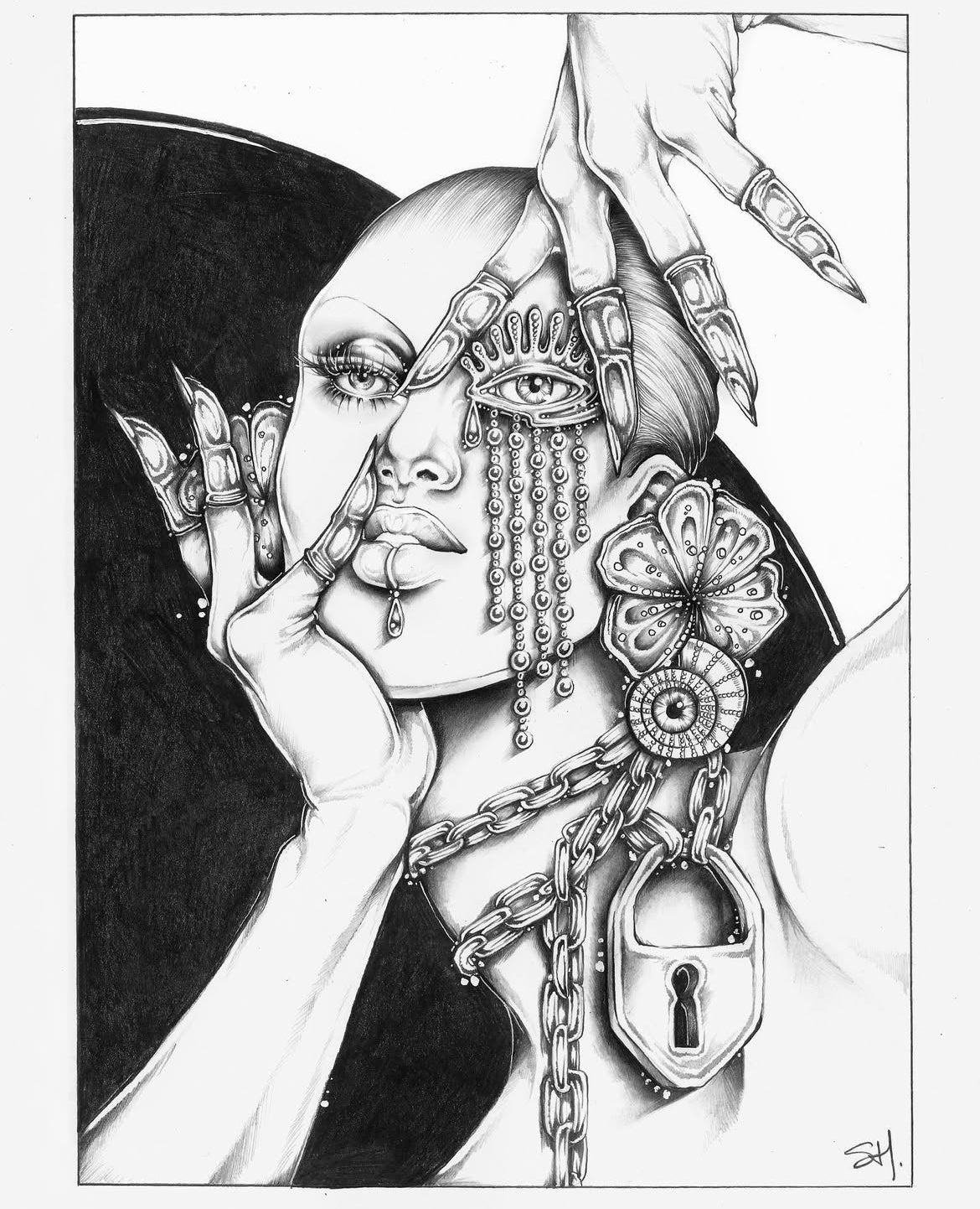 Original hand drawn Schiaparelli inspired illustration created using graphite pencil on paper. Inspired by a Bague Doigt Articulé, Gaze Pendant Earrings for eyes, Pansy Curtain Earrings and a Gilded Padlock Necklace. Unframed.