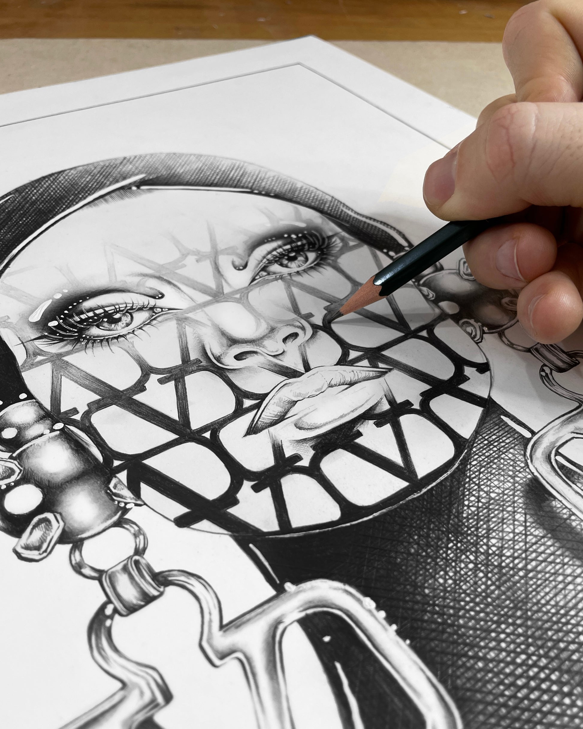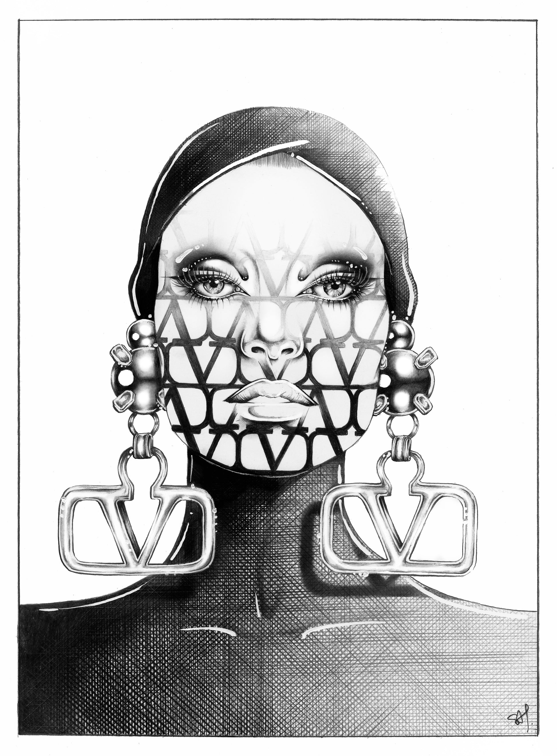 Original hand drawn Valentino inspired portrait created using graphite pencil on paper. Illustration inspired by the Toile Iconographe graphic pattern from the Spring 2023 Ready-to-wear collection with VLogo signature pattern makeup by Pat McGrath.